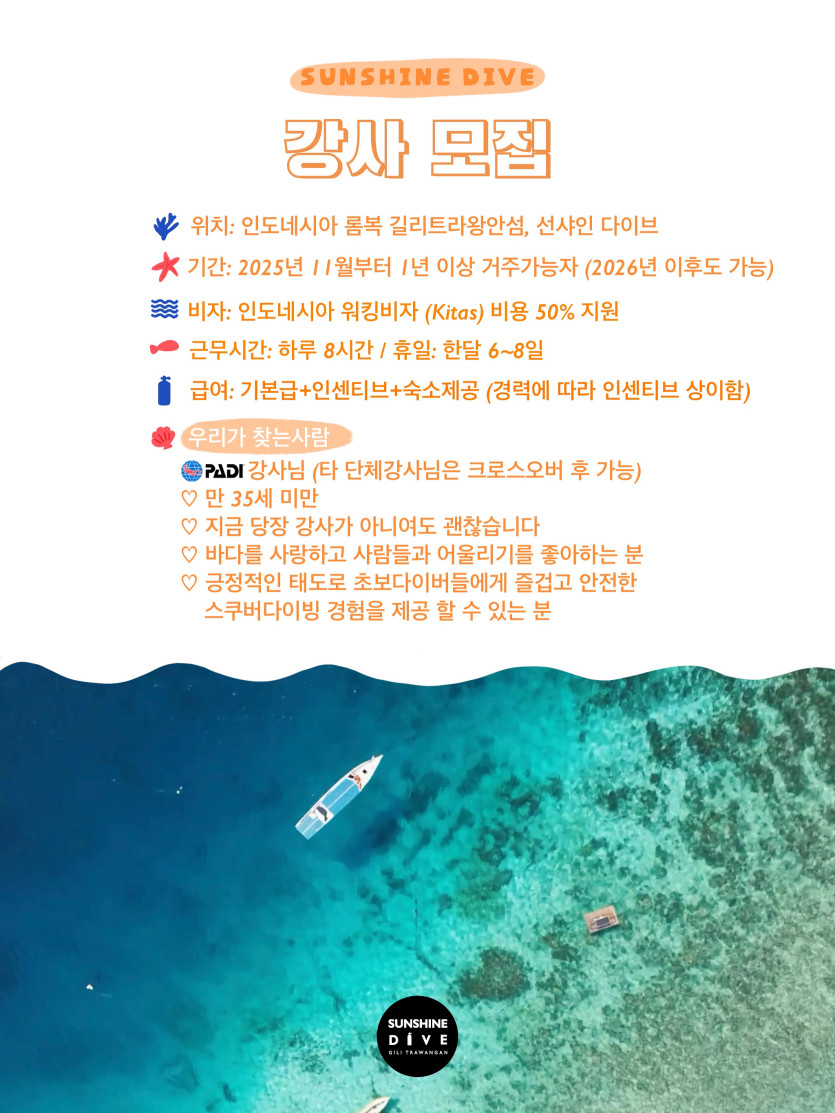 선샤인다이브에서 함께할 스쿠버다이빙 강사를 찾습니다.